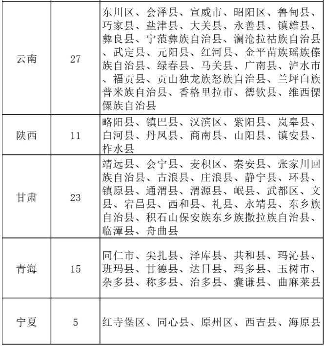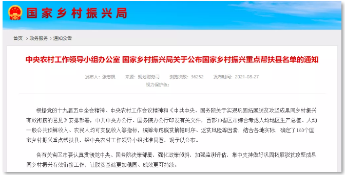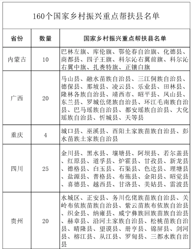 根据党的十九届五中全会精神、中央农村工作会议精神和《中共中央、国务院关于实现巩固拓展脱贫攻坚成果同乡村振兴有效衔接的意见》安排部署,中共中央办公厅、国务院办公厅印发有关文件,西部10省区市综合考虑人均地区生产总值、人均一般公共预算收入、农民人均可支配收入等指标,统筹考虑脱贫摘帽时序、返贫风险等因素,结合各地实际,确定了160个国家乡村振兴重点帮扶县,经中央农村工作领导小组批准同意,现予以公布。