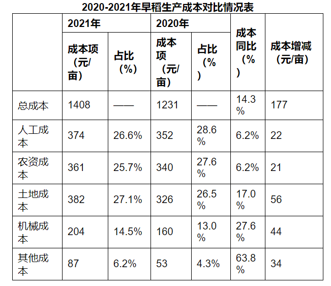 全年早稻成本总体增加,据基点县数据监测,全省早稻亩均生产成本为1408元/亩,同比增长14.3%,亩均增加177元/亩,其中增幅较大的为土地、机械成本。