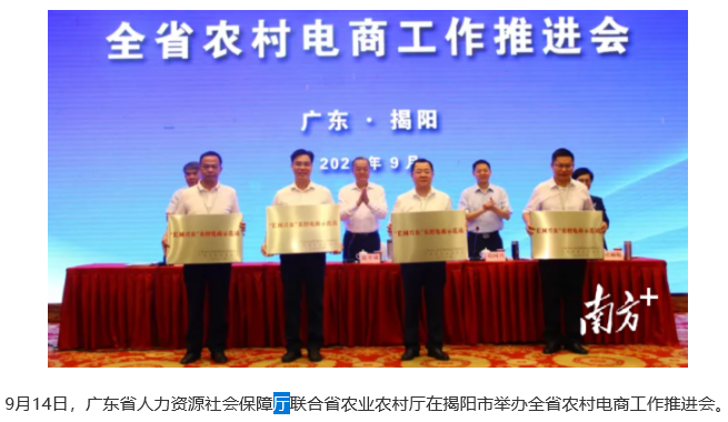 为推动“农村电商”工程高质量发展,9月14日,广东省人力资源社会保障厅联合省农业农村厅在揭阳市举办全省农村电商工作推进会。省人社厅厅长陈奕威、省农业农村厅二级巡视员梁友强等领导为部分地市“E网兴农”农村电商产业园、农村电商示范站授牌并讲话,对深入推进“农村电商”工程进行再加力、再部署、再推动。