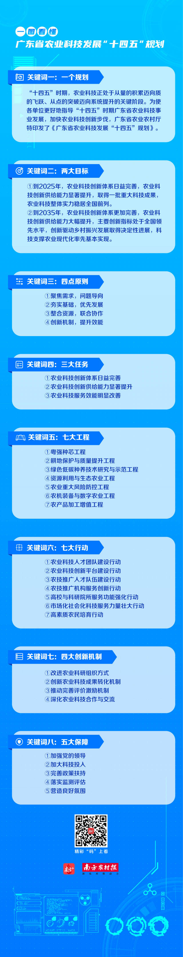 《规划》遵循的“四点原则”、聚焦的“三大任务”、实施的“七大工程”、开展的“七大行动”、强化的“五大保障”描述了广东省农业科技发展的新未来。