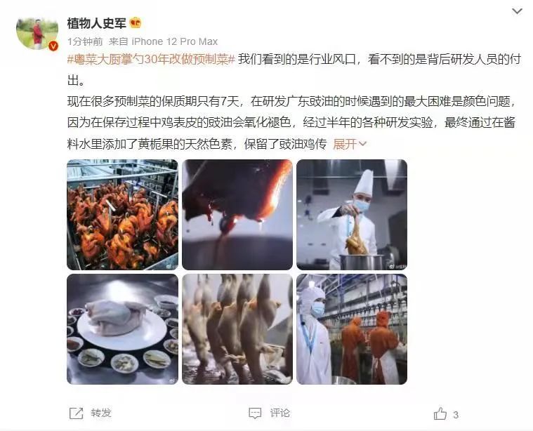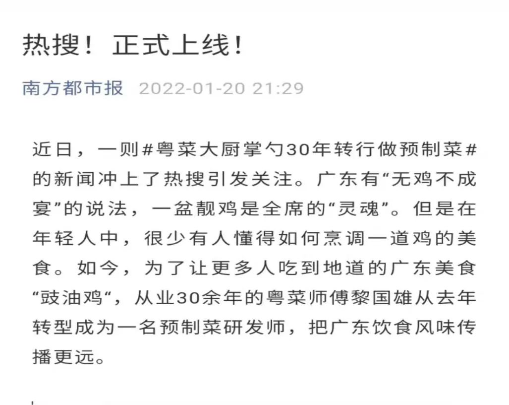在注意力稀缺的时代,想给受众留下深刻印象,“刷存在感”是必不可少的。广东省乡村振兴文化服务产业园从豉油鸡上市起持续发动宣传攻势。上市当日,“粤菜大厨掌勺30年改做预制菜”冲上新浪微博同城热搜榜第4名,以“南方农村报”、“央视网”、“南方都市报”为代表的官方微博账号,以及知名大V“植物人史军”、“蘸盐”等借助图片、视频推介产品。