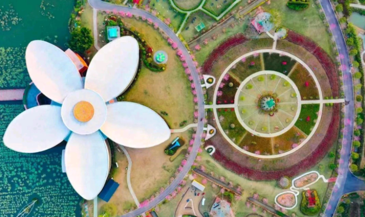 从高空俯瞰,位于珠海斗门莲洲镇的岭南大地田园综合体犹如一幅彩色油画,游人如织的“百草园”建筑如一朵硕大的莲花,在绿水青山间肆意绽放。9月23日晚,广东省庆祝2022年“中国农民丰收节”主会场活动在此举办。